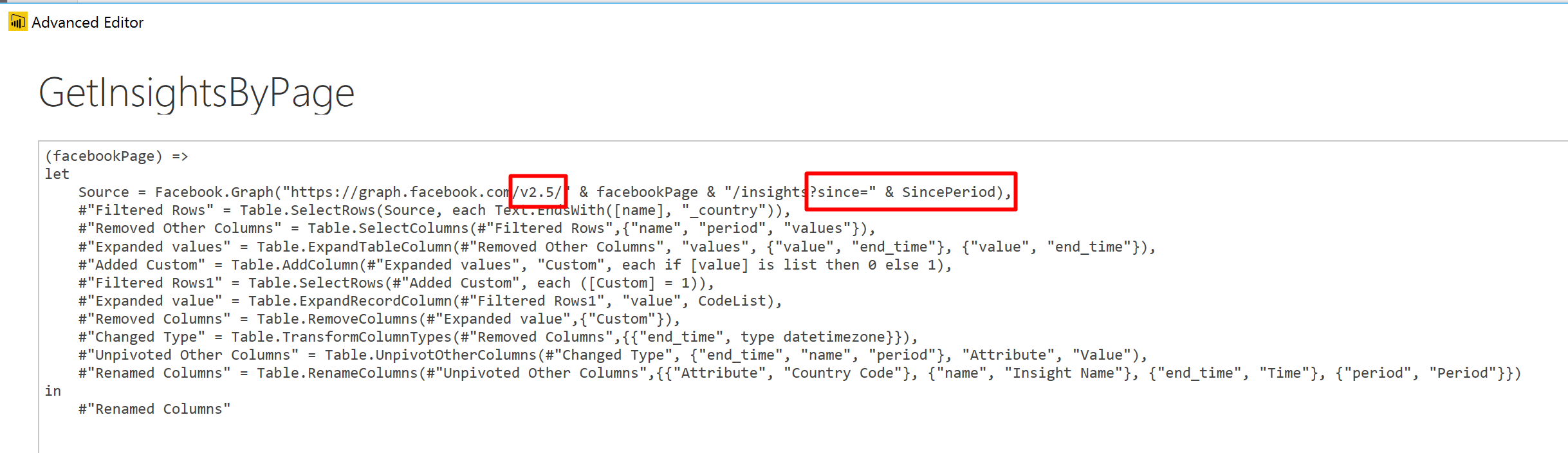 Note that by the changes above, we “tricked” Power Query to use REST API calls with version 2.5 of the Graph API instead of version 2.2, which Microsoft officially supports. The reason for this change is that the latest version works better with Page Insights, and returns data of longer periods.
