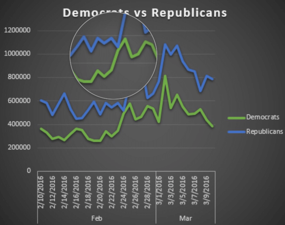 If you have interesting findings, please share in the comments (For example, on a certain day the democrats reached the same level of Facebook shares as the republicans. Do you know why?)