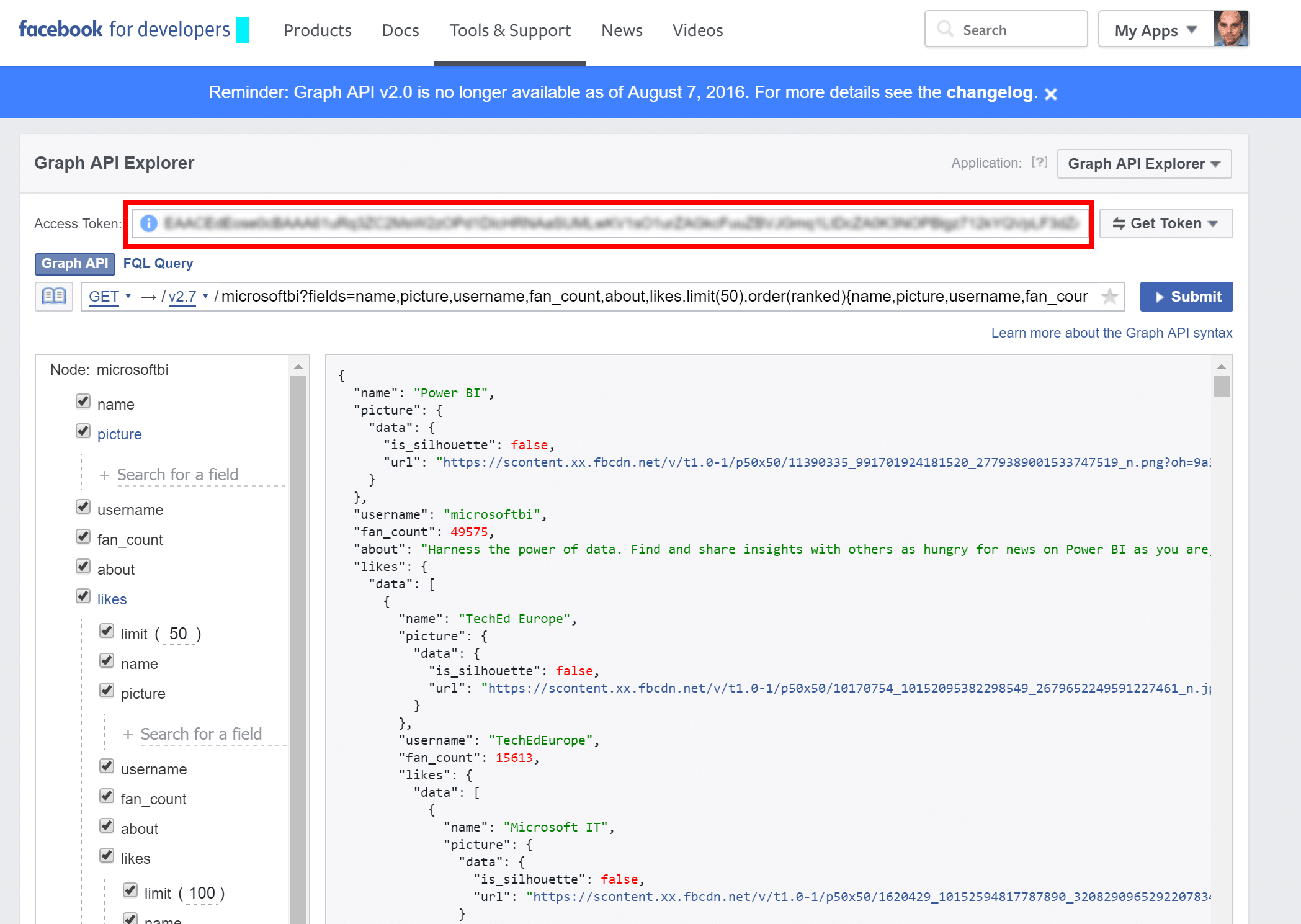Let’s start with the most important piece in this report – Its Facebook API calls. I didn’t use the Facebook connector as it usually fails to satisfy my peculiar requirements. Instead, I used the Web connector, and obtained the API token (highlighted in the screenshot below) from the Facebook Graph API Explorer.