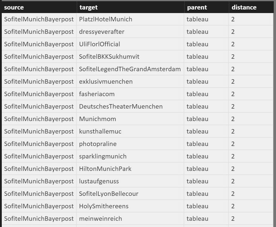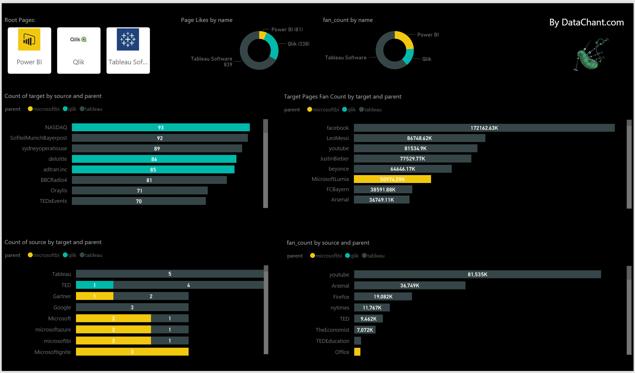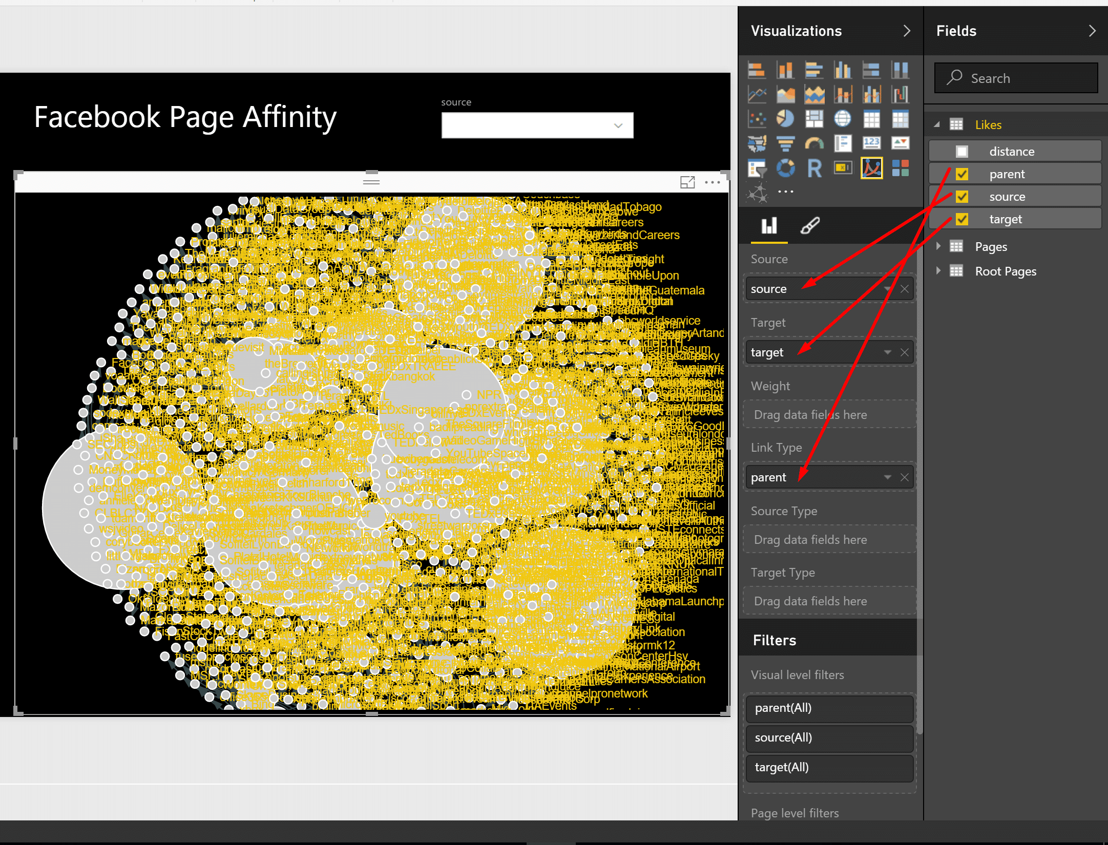 The core table that is used in this report has the following columns: Source, Target & Parent (the “root” page). You will find the terms “source”, “target” and “parent” in many visual titles. The column source contains all the Facebook pages that were found to like other Facebook pages. The column target contains the pages that were liked by the pages in source. And parent will always contain one of the three “root” pages.