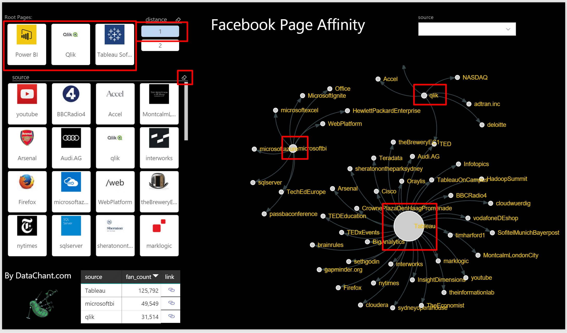 Check out the upper left slicer (This is the Chiclet Slicer custom visual). You can click on any of the three “root” pages: Power BI, Qlik & Tableau (or on any combination of the three by pressing the CTRL key). Click on Power BI to filter the Force Graph and reveal the tree-shaped graph whose root is Power BI, and his leafs are its 1st and 2nd distance pages.