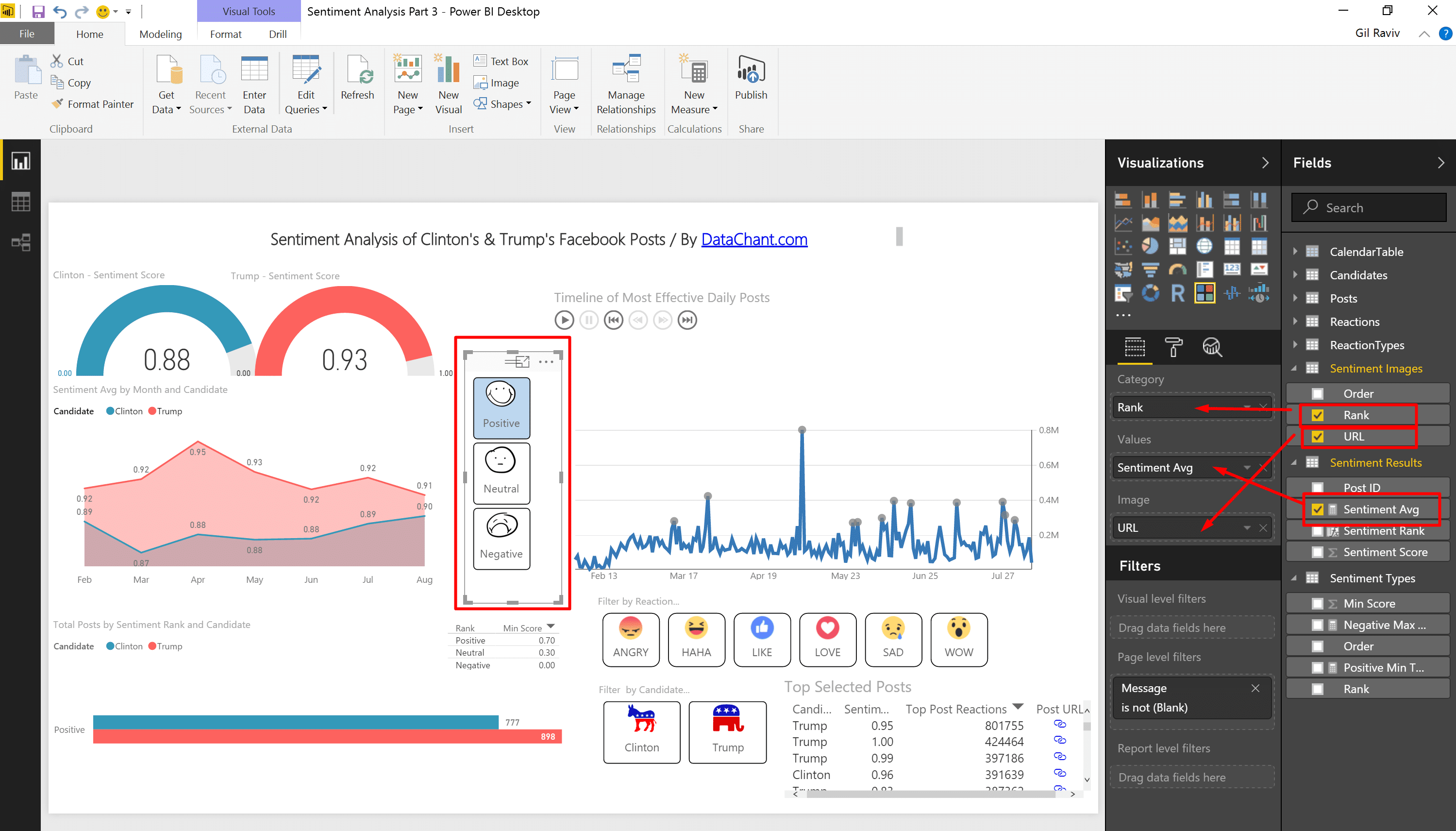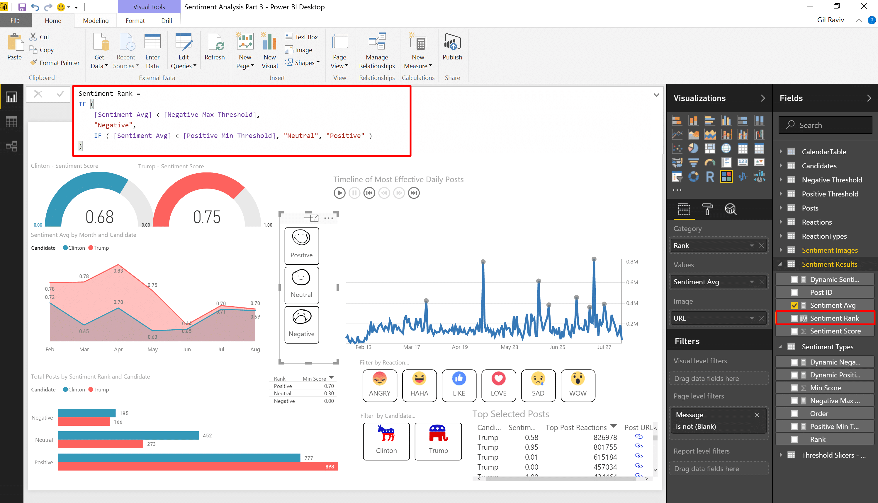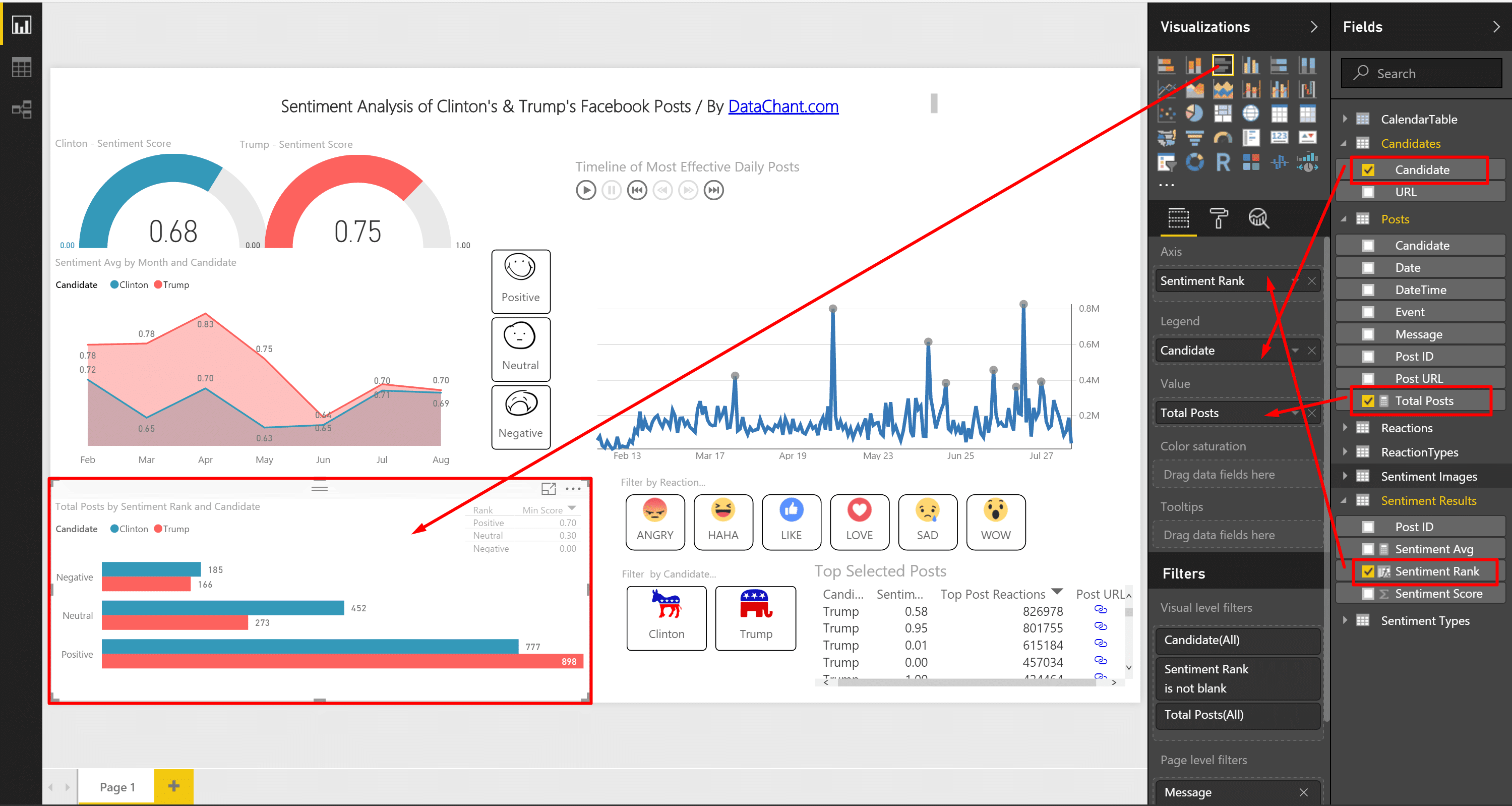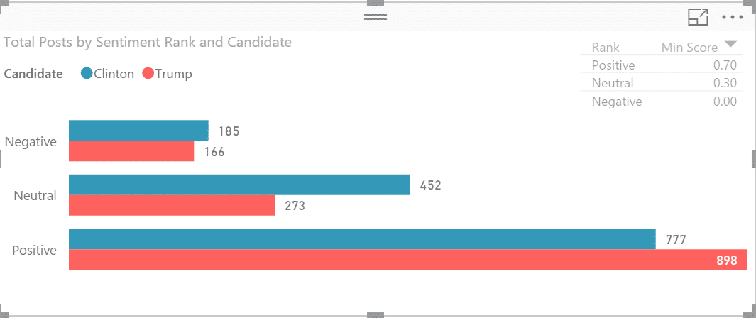 Add the Clustered Bar Chart. Drag and drop Candidate column from Candidates table to Legend, Total Posts from Posts to Value and Sentiment Rank to Axis.