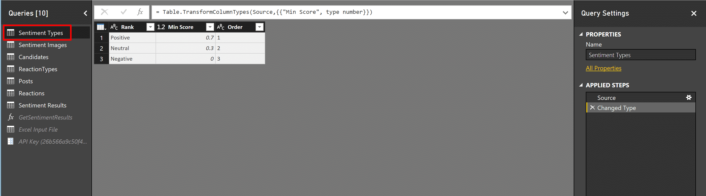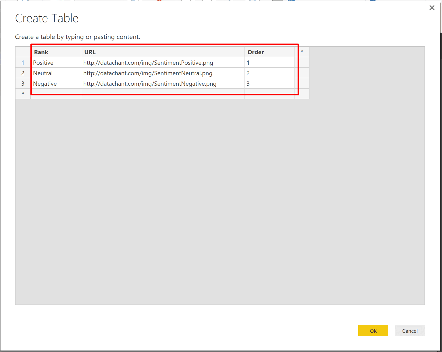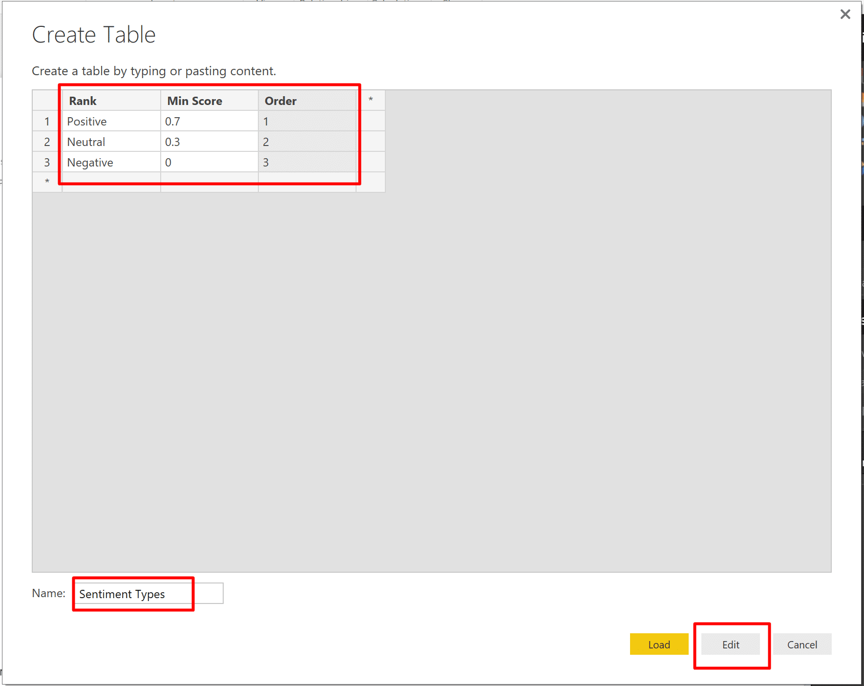 Add the columns Rank, Min Score and Order with the following rows (as seen in the screenshot below). When you are done, name the table as Sentiment Types and click Edit.