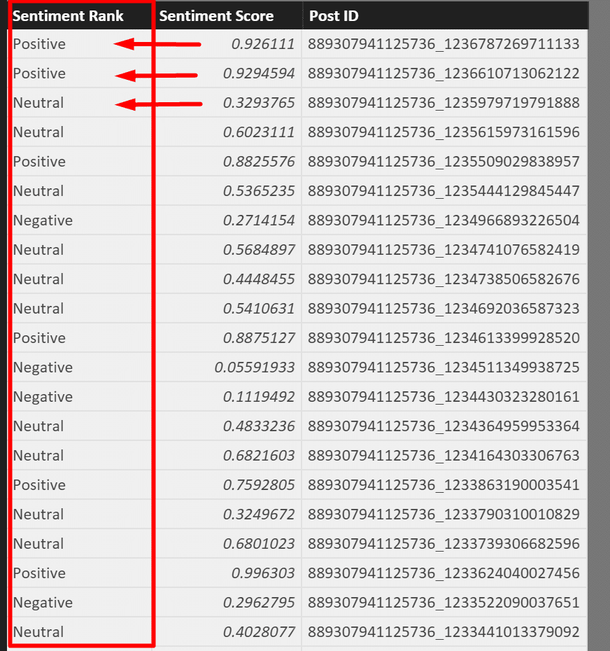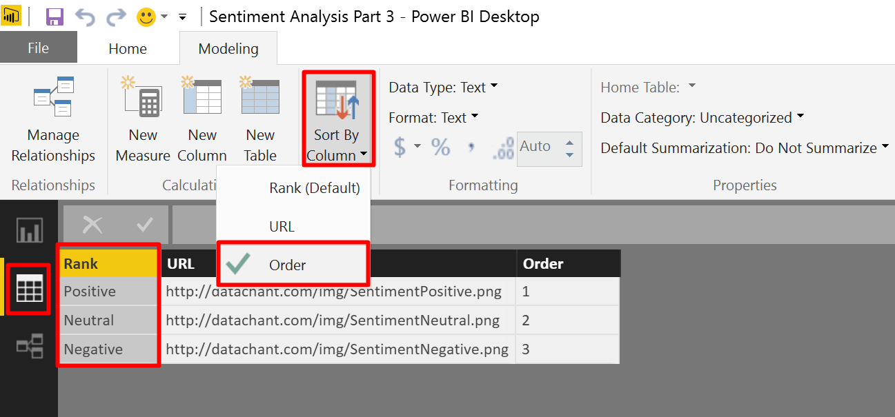 The advantage of the calculated column is clear. We can perform a row level calculation and convert the decimal number in Sentiment Score into its textual rank, as we defined in the table above.