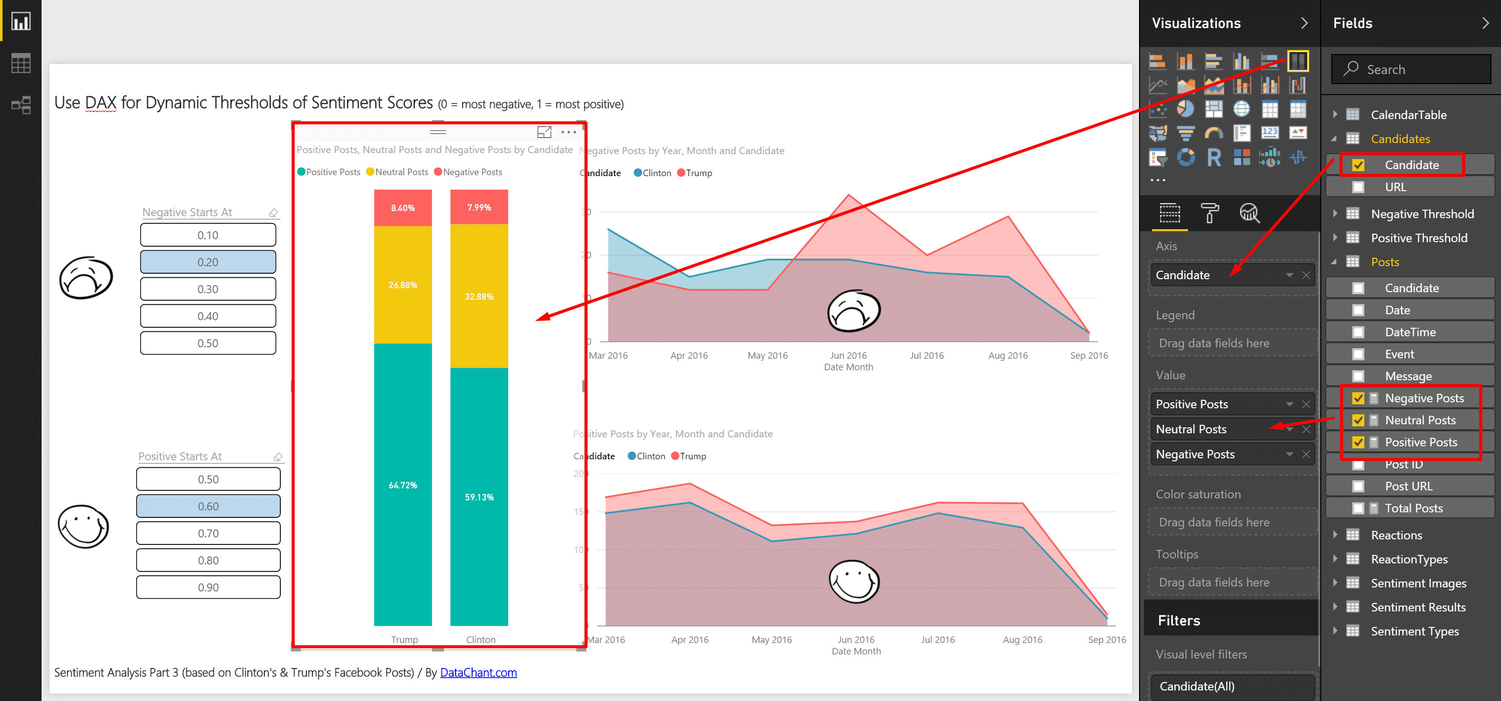We will now use DAX and disconnected slicers to dynamically define the thresholds for the three sentiment ranks. You can open this report on Power BI, change the thresholds to the right and see how they affect the results.