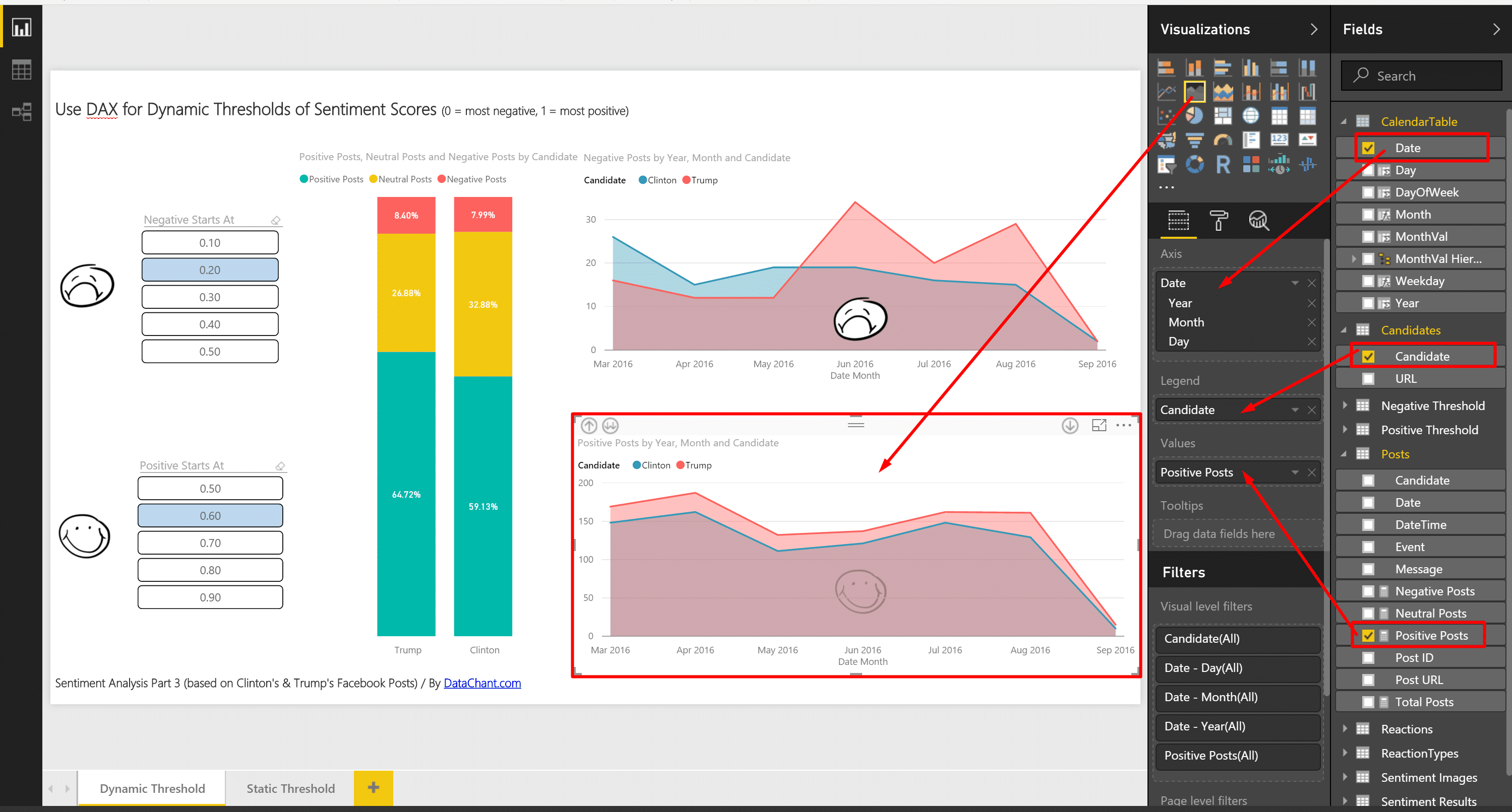 And finally, two area charts with Date in Axis, Candidate in Legend and Positive Posts in Value of the first chart, and Negative Posts in the Value of the second chart.