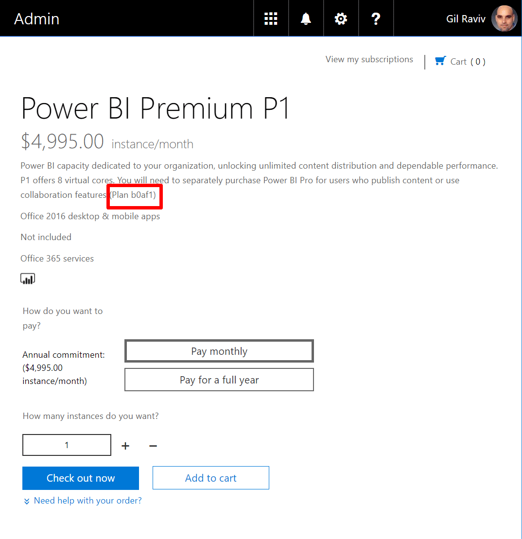 So, I decided to follow the purchasing experience of an Office 365 Billing Administrator (You need to be a Global or Billing Admin in your Office 365 tenant, to purchase Power BI Premium, or go through the Volume Licensing route, which is not cover in this article, Learn here about the different O365 admin roles.). Follow this walk through to purchase Power BI Premium P1, P2 or P3 nodes.