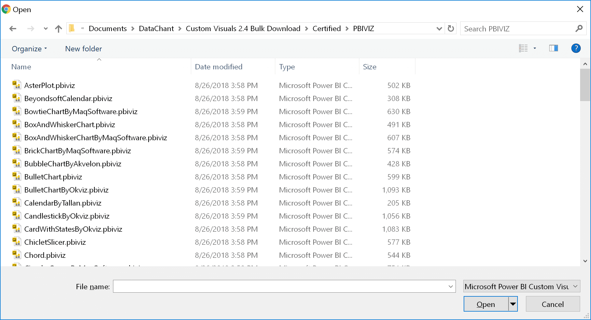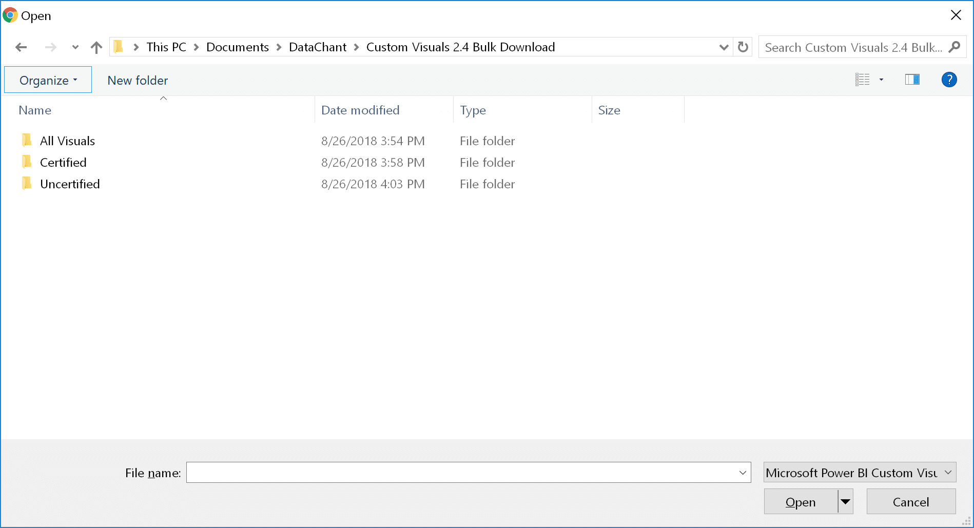 Unfortunately, when you select Browse, Microsoft currently only support individual import, so you can only upload one visual at a time. In my case, I already have all the custom visuals from the marketplace in my local folder, so I can select the Certified folder.